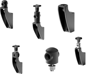 Műanyag vezetősín tartó elem marokcsavarral. Többféle furattal elérhető típus. Távtartó és korlát tartó elemek.